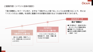 気候が良く体を動かしやすい春と秋には「ウォーキングイベント」を、そして夏バテなどで食生活が乱れがちな夏には「3食食べよう!健康万博2025」を実施しました。現在はこれまでの結果を踏まえつつ、冬の施策についてもOKANと一緒に検討を進めているところです。